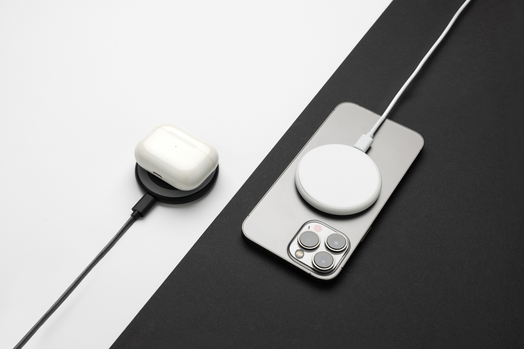 Unique design 15W magnetic wireless charger that gives you the option to charge either your mobile device, earbuds or iWatch. Simply click them on and start charging. Made with recycled ABS and recycled TPE. Total recycled content: 35% based on total item weight. RCS certification ensures a completely certified supply chain of the recycled materials. Including 120 cm USB A to USB C charging cable made from RCS certified recycled TPE. Packed in FSC® packaging. PVC Free. Output 9V.2.2A Output watch: 9V/0.4A, Output earbuds: 9V/0.5A. Input 9V/3A.